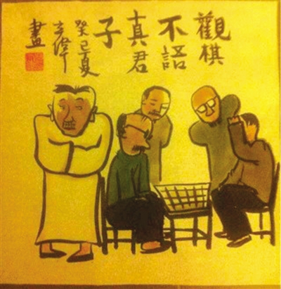 后来到单位,无事便到那案子上去写写,接着便又画起画来。从前的漫画,都是拿马克笔或签字笔信手画来,这次换上毛笔,比先前写字更觉亲切,也更有了文人画的味道。往日漫画右下角的一个圆圈、两条竖的何字的“H”标志,也换成了篆体的“立伟”印章。何立伟本就有旧式文人情结,喜读唐人绝句,这下在水墨的创作中,更加合心合性。“中国古代文人王维、苏东坡、郑板桥等都是精通书画的,这是养生的功夫,这个传统应该是延续的。”