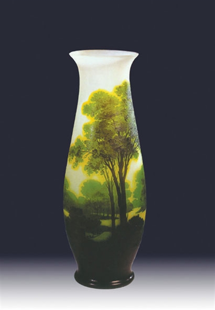 加莱率先给玻璃器戴上了“新艺术”的桂冠。他的作品上处处流露着天地造化之美,如《白地风景套料瓶》(图①),器形舒敛有致,在咫尺间营造出一片春意盎然的田园风光。它通过酸腐蚀或车刻来控制玻璃的厚度,达到颜色深浅的变化,以示景物之远、近、明、暗,作品呈现出油画般的透视效果。画面中巨树参天,湖光山色,映带左右,空间关系明朗,层次丰富,令人叹为观止。
