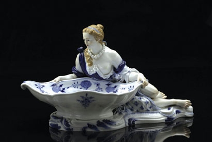 19世纪的迈森人物作品尤堪叹赏,其中青花瓷发色纯正,在欧洲仍然首屈一指。如《青花瓷塑人物盆》(图②),青花发色幽靓,人物造型准确生动。迈森的彩瓷也毫不逊色,富有新艺术风格的作品在19世纪末开始出现,乡村题材的瓷塑摆件在当时很流行,其中最具特色的是人物与动物相结合的造型,色彩雅丽柔和,散发着清新淳朴的自然气息。