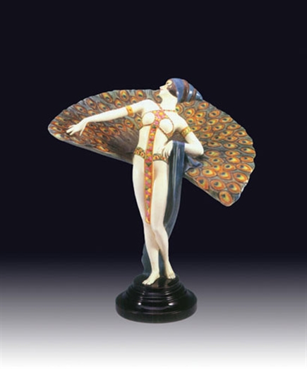 《彩釉陶舞女》(图③)是19世纪奥地利著名品牌“戈德沙伊德”颇多浪漫主义风格的作品。它一反古典主义那种崇尚理性、追求静穆与庄严的艺术观,而以色彩营造气氛,利用冷暖色调的反差所创造出的特殊气氛,来统帅整个作品的精神。作品通过热情奔放的彩绘,以及对抒情和动感的强化,将艺术家个人的感受摆到了首要地位,“个性美”替代了古典主义旗帜下那种唯一而绝对的“理想美”。