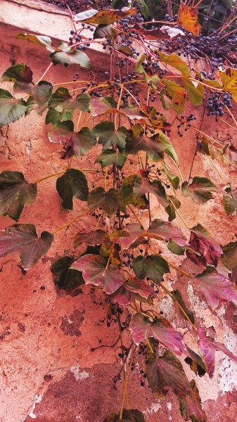 深秋,爬山虎的叶子又再度变为红色,不过这次不是春天的那种亮红色,而是暗示老熟的褐红色,不久这些叶子就纷纷飘落。