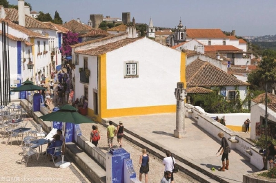 和欧洲寻常所见的旅游村镇一样,奥比多斯洁净安宁。沿街房屋,二三层建筑居多,虽然年代久远,却精心涂饰着白色墙体。窗户和门扉外侧,都嵌有花岗岩凿成的条框,和长满青苔的碎石路相映成趣。与东方城镇外观不同之处,是这些粉墙建筑的下缘和屋角,每每用蓝色和铬黄色颜料刷出宽边,呈现出特有的地域风情。房舍的门扇和窗户遮阳板照例是湖蓝色的,绚丽夺目。而从山坡上鸟瞰,鳞次栉比的屋顶,都是红色筒瓦,与远处的绿色原野相映成趣。