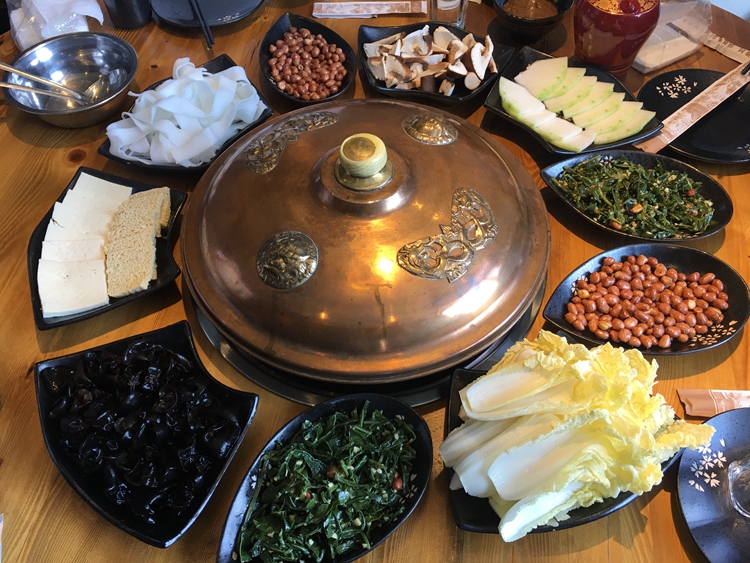 记得各种资料每每记载,成吉思汗出兵远征,带着羊群作会跑的食堂,一路杀羊飨军,不过拢一堆干草牛粪点燃,取头上的铁盔翻过来作锅,白水煮带骨羊肉,是为手把肉鼻祖,后来发现肉切成薄片,沸水一烫,即可快速果腹,渐渐发展成了涮羊肉。
