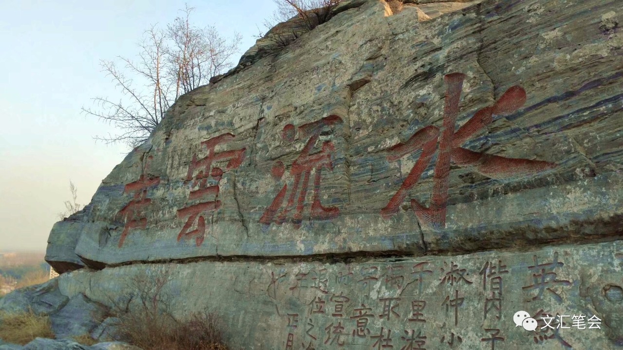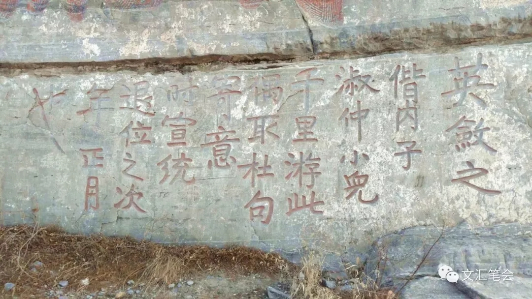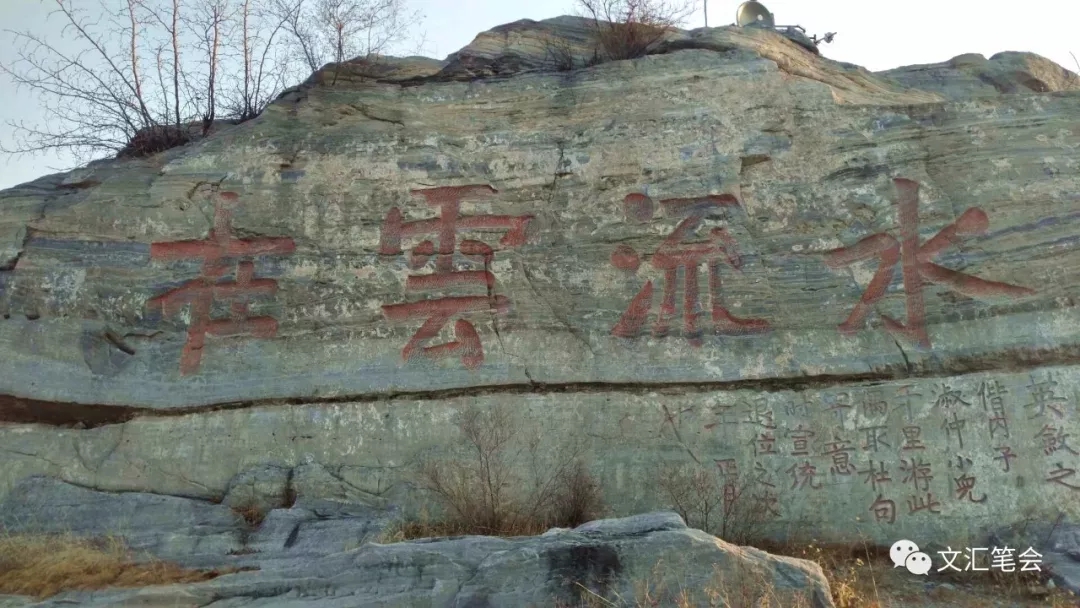 其二是“水流云在”石刻。宣统退位次年,英敛之和夫人(就是他拐来的格格)携子英千里(英若诚之父)游显龙山,峰顶巨石错垒,有一面如屏铺展,遂取杜甫诗意,题“水流云在”四个,刻于石上,立于天地间,每个字有一米半见方。