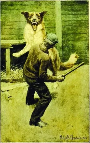 布雷特为这部小说的初版本作了精美的包装,聘请两位青年画家为之作了十幅彩色插图,印行了一万册,很快销售一空。上面这幅插图里,小说的主角巴克即将在棍棒下领教到惨痛的教训。画家古德温(Philip R. Goodwin, 1881-1935)出道极早,十一岁就有绘画作品被著名的杂志采用。他先在罗得岛设计学院和纽约艺术学生联盟习艺,后来转到费城的德雷塞尔科学工艺学院,师从以自编自绘的少儿读物驰名的插图家霍华德·派尔。他受聘创作这些插图时,年仅廿二岁。日后他的作品,大多以野生动物、捕鱼打猎及户外生活为题材。