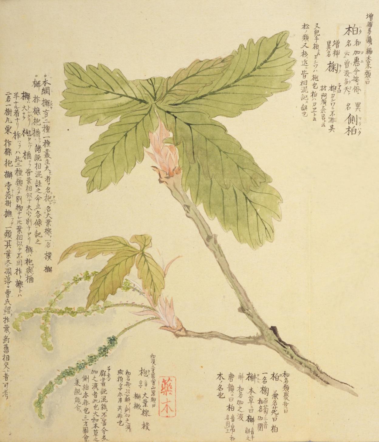 【日本】毛利梅园《梅园草木花谱》:槲(日语中称作柏)
