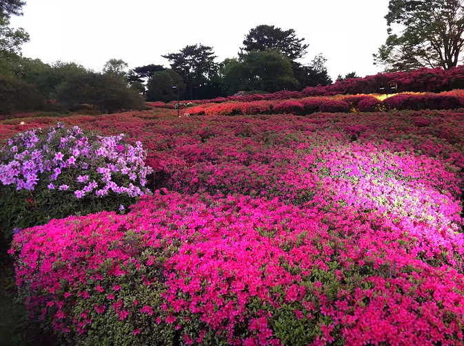 伊豆高原有二座山,一座是大室山,因在山脚下植有百余种品类的樱花,那一片也被誉为樱花的故乡;另一座山是小室山,在山茶花开后的四、五月就是杜鹃花开映山红的时节,远远地望去如蔓延在山坡上的红地毯、又似无限延伸起伏的彩带飘向一片汪洋,站立在小室山的山顶,北望是富士山、东览是白帆点点的相模湾、南瞰是伊豆半岛外的七个离岛和房综半岛,西眺是天城连山,360度宽屏,视野无限。三万五千平方米40种品类10万颗木本杜鹃,每朵五六个花瓣、花蕊似蝴蝶须毛、一朵挤着一朵,一枝挨着一枝、楚楚动人,将小室山装扮得分外妖娆。