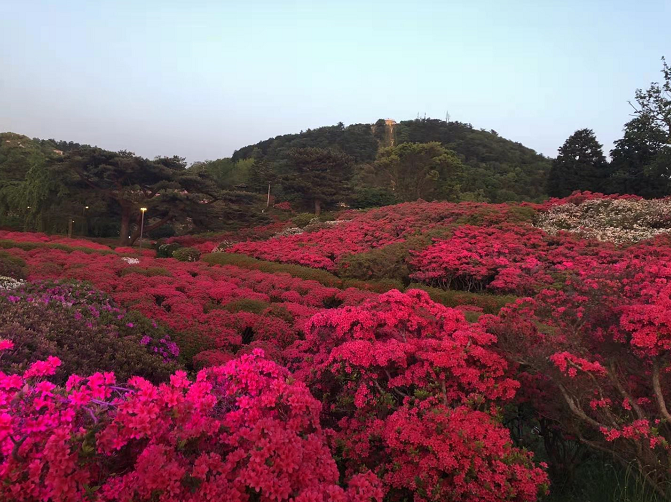 村落外、海岸边,映山红满天。徘徊在杜鹃花间,海风拂面涛声响,夕阳山外山。夜幕降临了、为杜鹃花事而设计的红色系列的射灯燃起了。最美夕阳红、温馨又从容,黄昏夕阳、交融弥漫,不见发端、不见终极,将美丽闪烁于山坡的杜鹃,相比蓝天白云阳光普照下灿烂多彩的杜鹃,更多了一份壮观,更使人激亢。不知是夕阳染红了苍穹、还是杜鹃映红了天空、抑或子规夜半的啼血,侵染了漫山的杜鹃。红光闪烁,“红星闪闪放光彩、红星闪闪暖胸怀......”红星、红旗、红花、红光、还有红的夕阳,一片红色融入红色血脉、激荡着赤字之心。