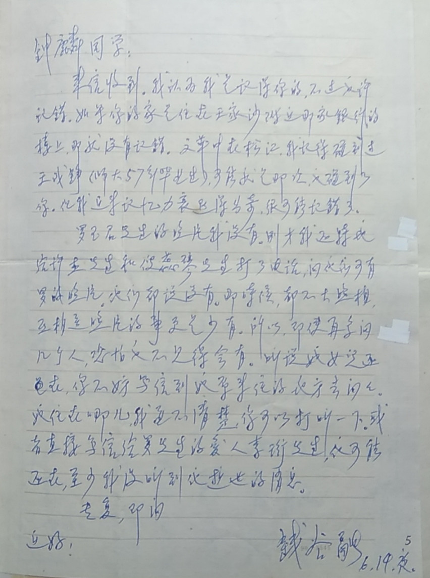 来信收到。我认为我是记得你的,不过也许记错。如果你的家是住在王家沙附近那家银行的楼上,那就没记错。文革中在松江,我记得碰到过王成铮(师大57级毕业生),可能就是那次,也碰到了你。但我近来记忆力衰退得出奇,很可能记错了。