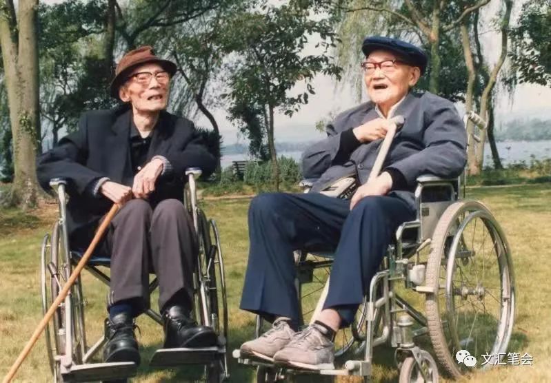 这天秋高气爽,汪庄显得格外明媚秀丽。两位老人坐着轮椅徜徉在西湖边的林荫小道上,边行边赏盛开的桂花和各种争奇斗艳的名贵花木。轮椅被推到大草坪上停住了。二老面对西湖尽情地沐浴秋日阳光。当巴老问起共同熟悉的日本朋友时,夏公说:“因体力不支,我一般都谢绝见面了,但有些日本外宾到京时,会转弯抹角地传话来,说巴老、冰心我们都见了。我听后,情面难却,也只好见了。事后,我问冰心大姐,才晓得根本没这回事,他们也学会了钻空子,真拿他们没办法。”一席话把巴老给说乐了。此时,我见两位老人手里都提着拐杖,面对面谈笑风生的模样,便迅速对准镜头,连按快门。夏公见到这张照片后,用他与生俱来的幽默作了点评:“两个老叫花子……”(见沈芸《往返于大六部口和武康路之间》)