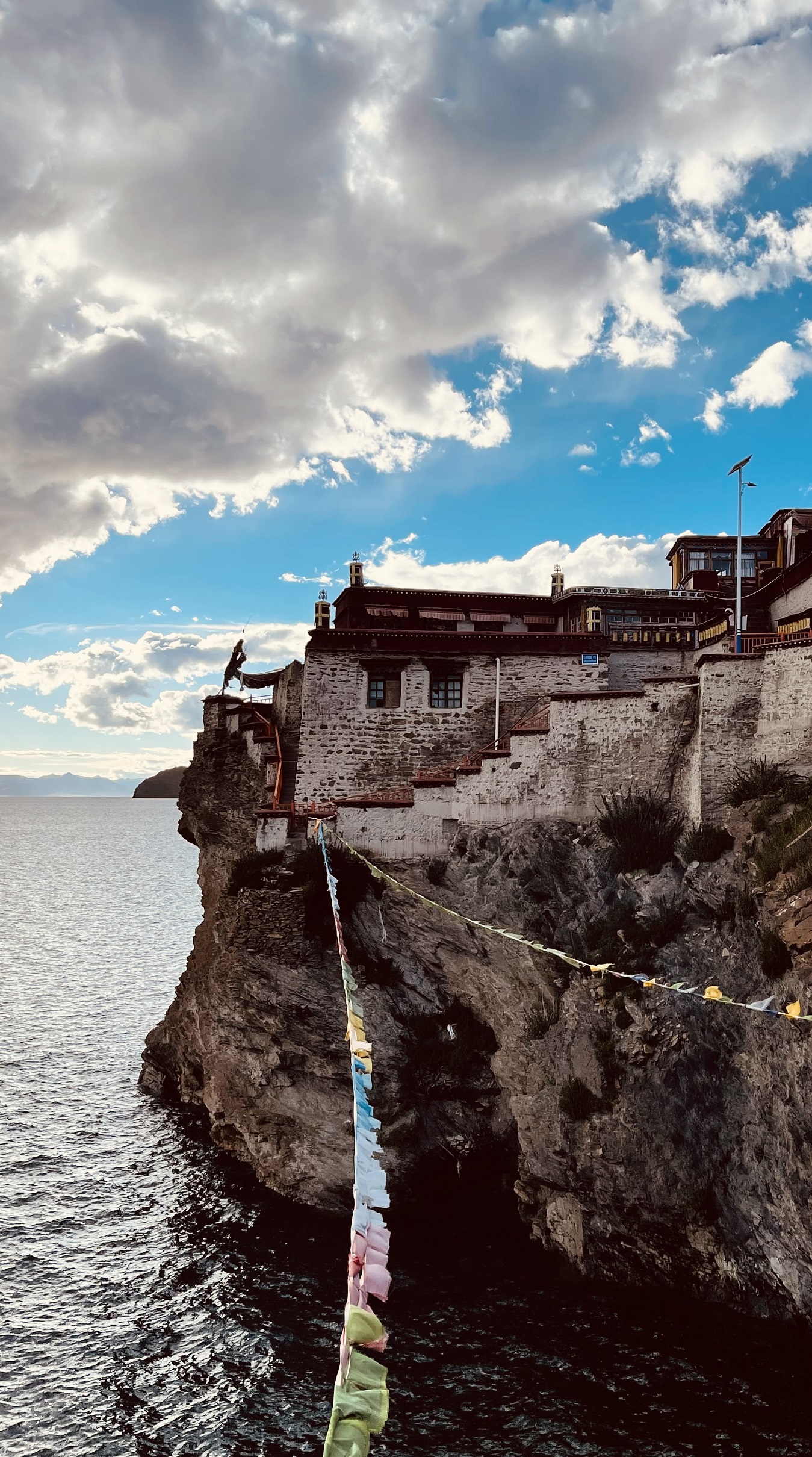 车行驶到普莫雍错对面看过来,推寺像悬在普莫雍错之上。湖水的绿与天空的蓝连成一片,却似被推寺的红墙划开一道口子。