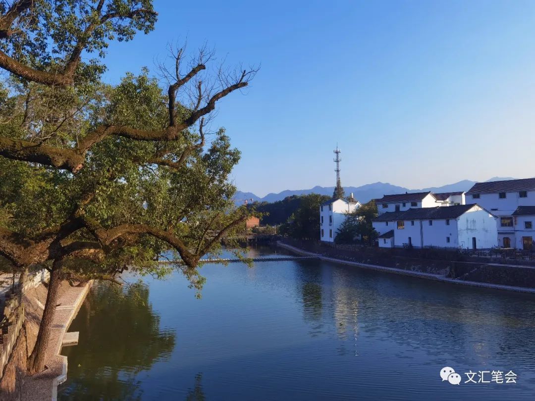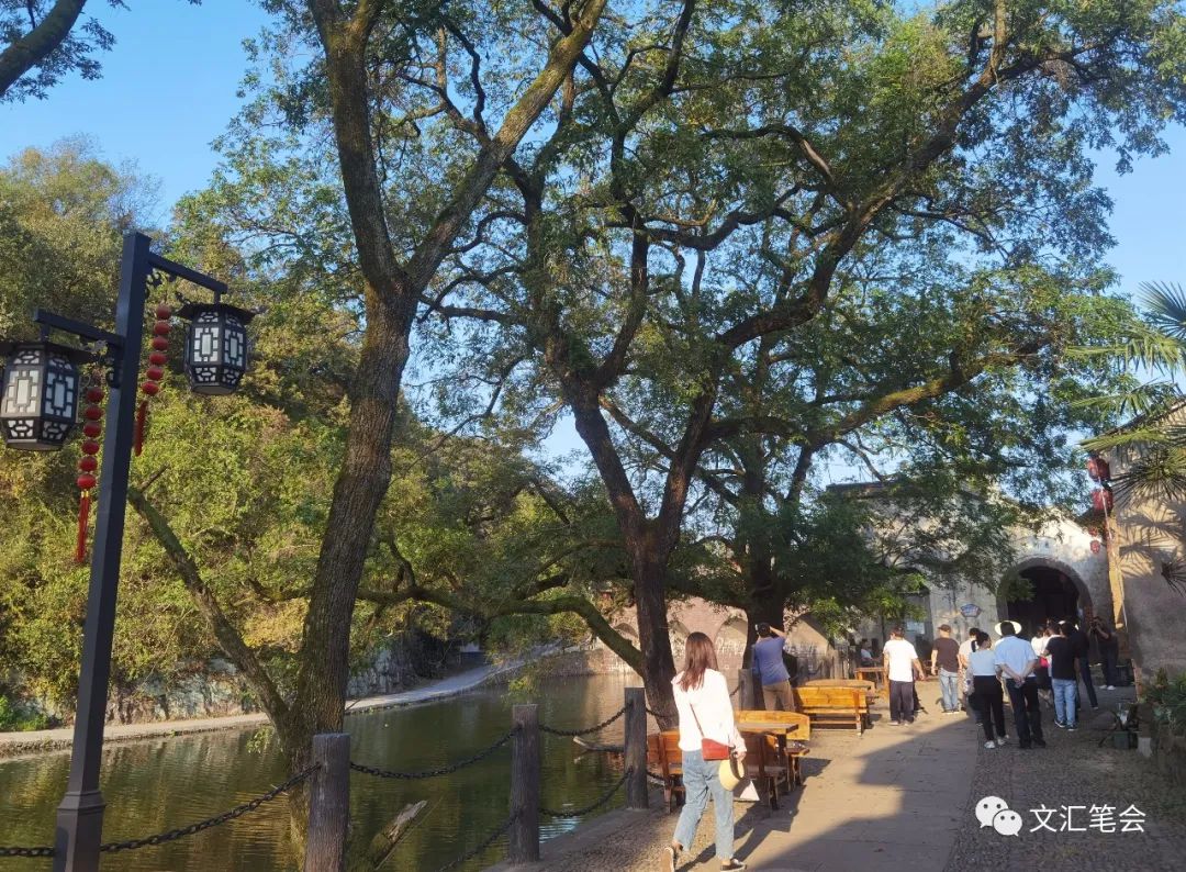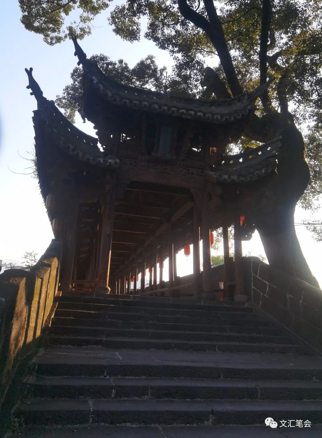 我有幸走上了通洲桥,很古朴的一座廊桥,平静的江水从桥下缓缓流过,桥头有一棵巨大的梓树,看上去像香樟,但树干上挂着牌子明确写着梓树,还写着它已有两百多岁了。那么,这棵梓树,是见证过曹聚仁和王春翠的爱情的。两个情窦初开的少男少女,一个十五岁,一个十二岁,美好而又单纯,单纯而又热烈。
