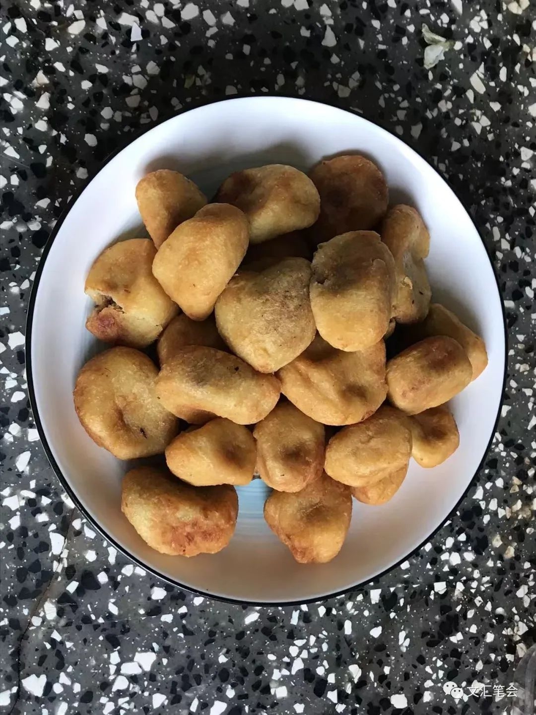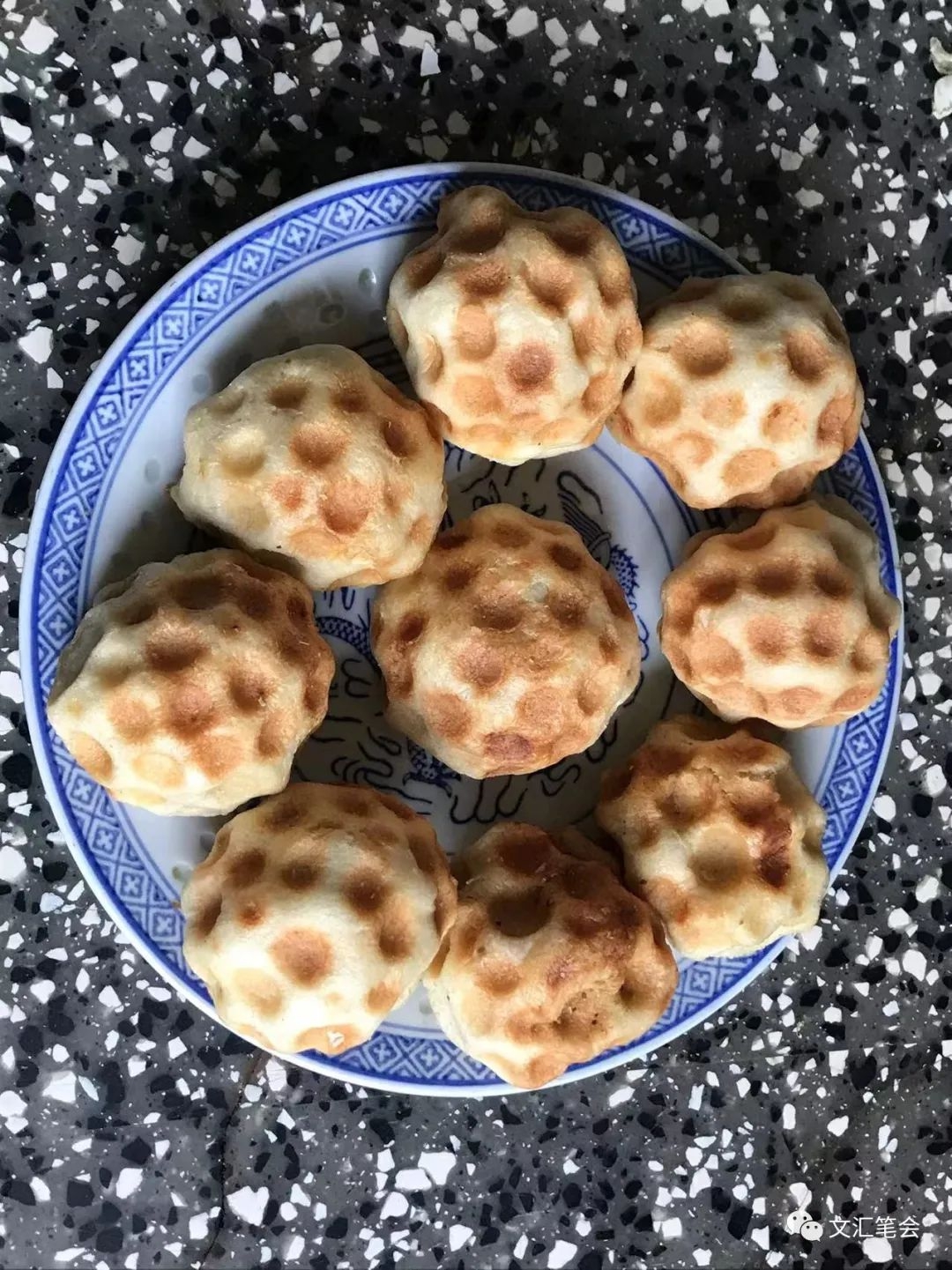 至于石头饼(当地人称圪烙饦),也是自家做的。深鏊子与栗子大小的黝黑石子(河卵石)全是借来的。升火将鏊子里的小石子反复搅拌加热,然后舀出一半,放入另一只热鏊中保温;余下的平摊锅中,将面饼放入,再将舀出的石子均匀地铺在面饼上,慢火烙烤,不多久,这两面压有石子凹型的饼就熟了。不过,记得当年的石头饼,不像现在,中间包裹着甜咸两种馅,它是没有馅的。至于今日大受欢迎的个头如普通点心大小的小石头饼,更是有包着椒盐馅、花生馅、果脯馅、核桃仁馅、红糖馅等品种。