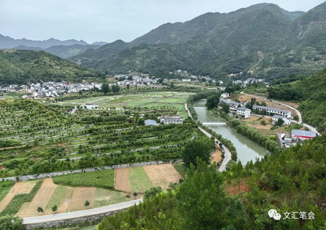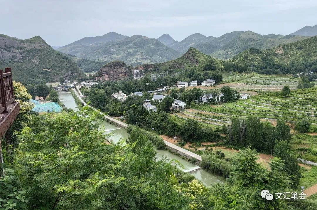今年5月,我去商洛,再度与秦岭相遇。看秦岭能看到啥呢?以人之渺小看秦岭,如同一只蚂蚁围着一座大山转,走走停停,只看到个苍茫。好在法官庙村有一处观景台,登高望远,有了景深。山下名为月亮湾,一条宽阔的人工渠绕山而来,如同黄色河水的高速路。远处的梯田生长金黄与翠绿的农作物。白墙青瓦的农舍包围绿树,宛如桃花源。农舍梯田后面,兀立两座苍翠的小山,两山相连。秦岭的山峰包藏在起伏的山脉里,但法官庙村这两座小山似乎是出走的大象,脱离了山的怀抱,化为梯田的屏障。一座山顶上挂着瀑布,断崖间,约有百十米宽的瀑布喷涌白练,在深绿的群山间颇为醒目。远看,瀑布没有傅抱石画的瀑布那么长,但很宽。我们下山走近瀑布,看到它既宽又长。水声震耳,水雾沾满衣服。在观景台上,我看到白云在秦岭之巅缓缓而飞,如身穿古装的女神。往东南看,人工渠的来路如同一座大峡谷。