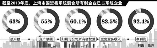 数据显示,截至2013年底,上海市国资委系统混合所有制企业已占系统企业总户数63%、资产总额55%、归属母公司所有者权益60.1%、主营业务收入83.5%、净利润92.4%。