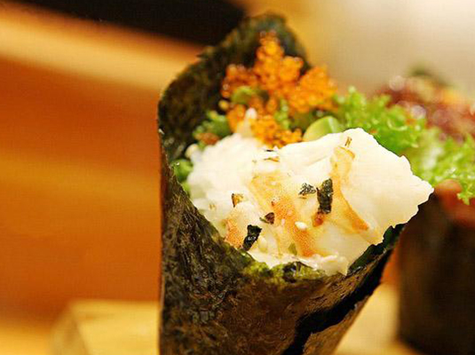 美味Q弹的大虾搭配牛油果,让不爱吃生食海鲜的吃货们也可以一饱口福。牛油果手卷里的饭恰到好处的点缀了食材的鲜美,并不抢占风头或是造成累赘,加上色拉酱更是美味无比。