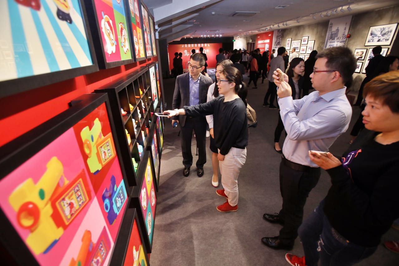 消费者在“肯德基波谱艺术老玩具展示区”热议玩具