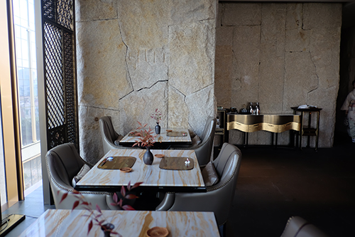 穿过走廊就是另一番天地,主用餐区被超大落地窗包围,黄浦江和陆家嘴高楼景致就在眼前。天花板上的叶形装置呈波浪形,抬头就像看见密密麻麻的满天繁星,瞬间少女心爆棚。