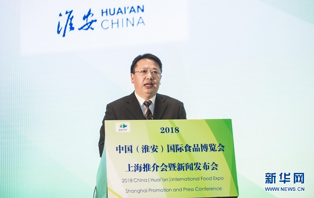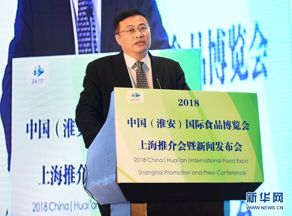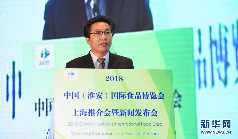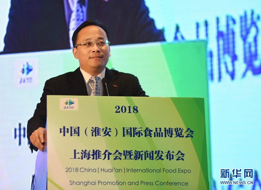 图为中国(淮安)国际食品博览会组委会副秘书长、淮安市商务局张冬来局长现场推介。新华网吴恺 摄