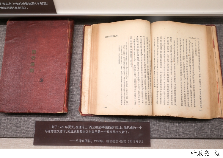 在陈列馆的展示柜内,一套新增的1938年版红色《西行漫记》定格在了第183页,上面清晰地写道:“到了1920年夏天,在理论上,而且在某种程度的行动上,我已成为一个马克思主义者了,而且从此我也认为自己是一个马克思主义者。”
