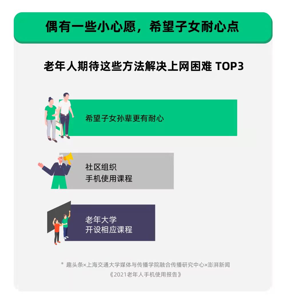 虽然老年人已经习惯使用手机来获取信息,但横亘在他们面前的现实问题是,对于信息的识别能力和判断力,他们比年轻人低很多,再加上年轻人对初次迈入网络世界的老年人缺乏耐心,对老年人的信息分享往往没有正面反馈,导致老年人对学习智能手机使用缺乏信心。
