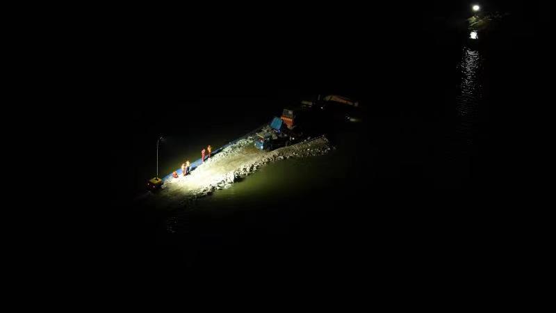 在溃口封堵一线,中国安能救援的各类高精尖装备联合作战封堵溃口。溃口处,推土机、挖掘机、自卸车等重型工程救援装备,争分夺秒高效作业。河面上,多波束无人侦测船进行溃口水下部分及河底冲刷数据采集和三维建模。地面上,全站仪每一小时对溃口口门宽度、溃口水位高程、溃口附近堤坝变形情况进行测量和监测。空中,测流无人机全程对水流变化和现场情况进行侦查。一批高科技装备在这次溃口封堵中运用,极大地提高封堵效率。