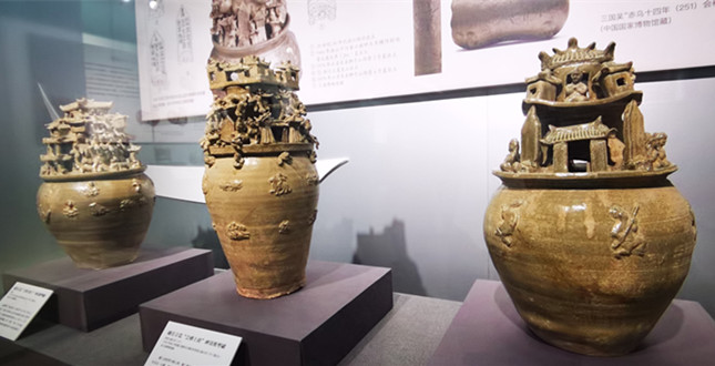 东汉中晚期青瓷器首先在浙江烧制成功,归功于南方盛产瓷石,以及长期烧制印纹硬陶和原始青瓷的工艺积累。烧制瓷器的龙窑经过不断的改进,浙江上虞地区最终产生了成熟的瓷器,并在三国西晋时期进入第一个高峰期。本次展出的安徽马鞍山朱然家族墓出土体型硕大的青瓷羊是三国西晋越窑生产鼎盛时期的代表作。堆塑罐是专为随葬而烧造的明器,部分堆塑罐碑铭中出现“会稽上虞”、“会稽出始宁”,均指今浙江上虞地区。