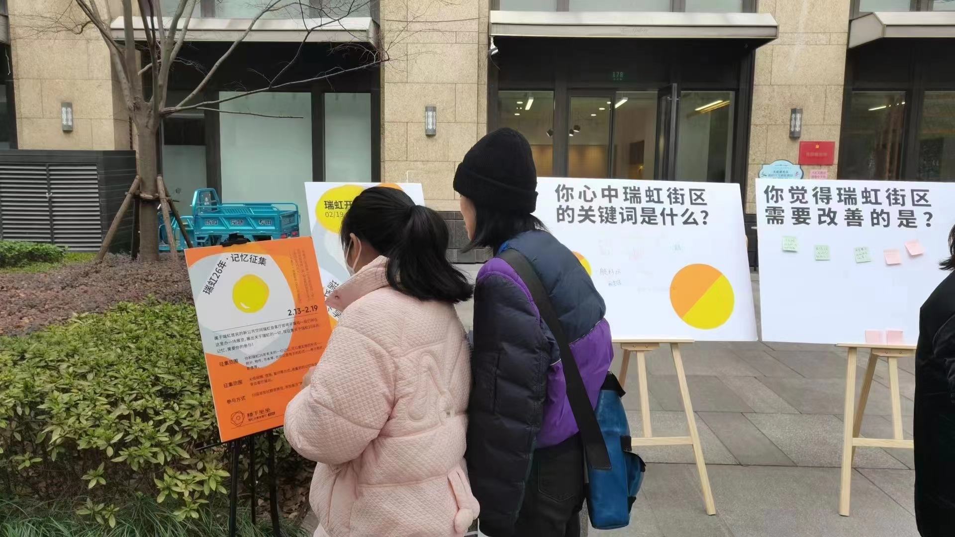 除了现场征询,居委会干部还通过居民访谈等形式收集意见建议,在共创中利用好每一寸公共空间。比如,有居民结合小区国际化的特点,提出用26个英文字母开头组词,表达对社区的印象;有居民建议手绘“瑞虹地图”上墙,把社区中、商场里的公共服务空间标注出来,为新居民“指路”,也找到今后开展社区活动的方向。