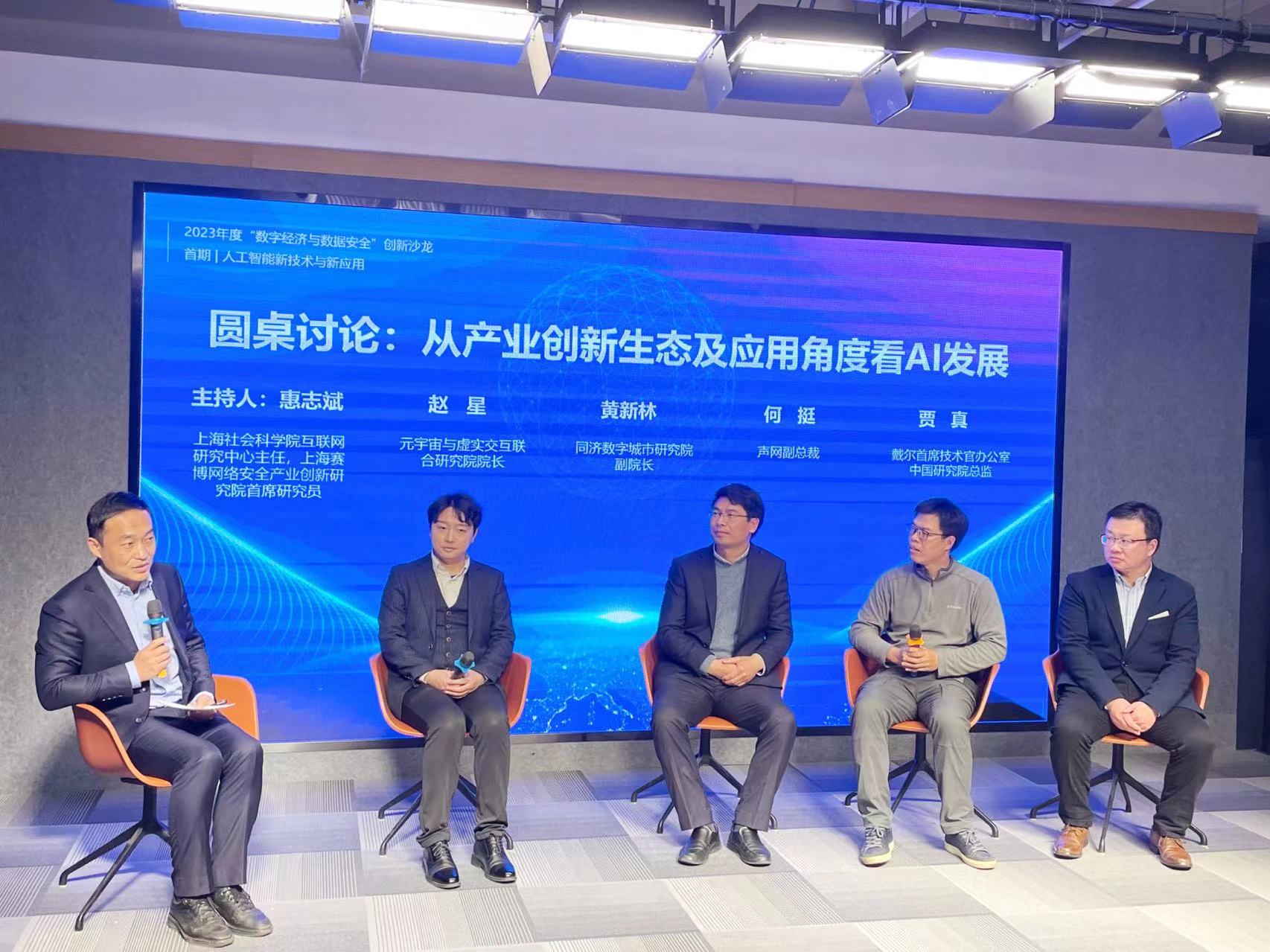 首期沙龙现场,复旦大学、同济大学、上海理工大学等高校专家与20家数字经济头部企业的代表共聚一堂,以“人工智能新技术与新应用”为主题,关注AIGC等近期热点话题,重点探讨人工智能技术的未来发展趋势,以及产业化应用和创新生态构建。