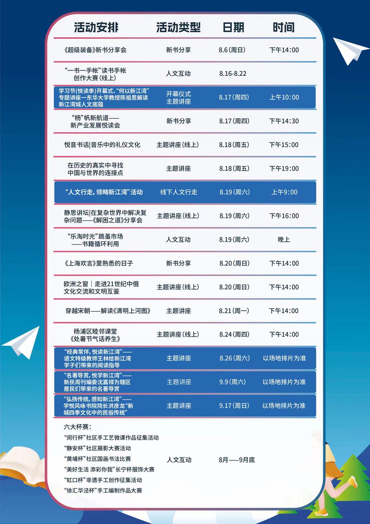 此次学习节共有五大主题活动:东华大学教授陈祖恩带来“何以新江湾”专题讲座,将解读新江湾城人文底蕴;“人文行走,领略新江湾”活动,则以新江湾城生态走廊为起点设计人文行走路线,以“线上+线下”的形式领略新江湾的变迁与风貌;语文特级教师王林将给新江湾学子们带来“经典常伴,悦读新江湾”阅读指导;“名著导赏,悦学新江湾”,是由新民周刊编委沈嘉禄为辖区居民解读经典名著背后的故事;“弘扬传统,感知新江湾”主题讲座中,学悦风咏书院院长洪彦龙从新城四季文化出发,近距离展现传统文化的魅力。