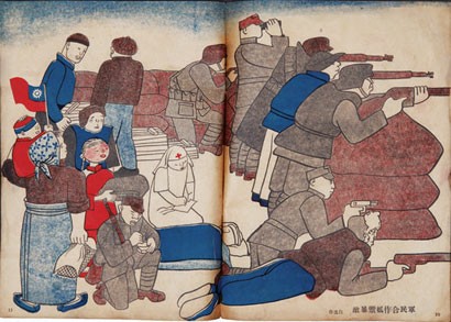 《抗战漫画》第六期刊登漫画《军民合作抵御暴敌》。