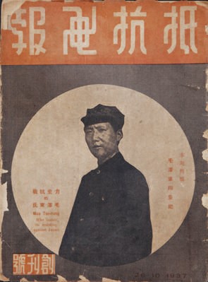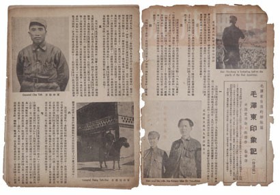 《抵抗画报》创刊号刊登美国爱德迦·斯诺《毛泽东印象记》。下图左页:朱德(上)、彭德怀(下),右页:毛泽东在演讲(上)、毛泽东与贺子珍(下)。