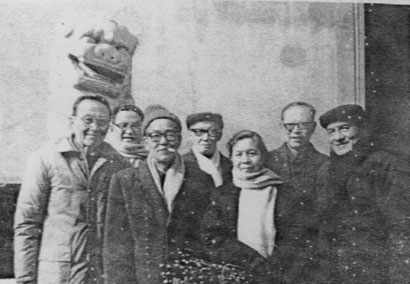 1984年冬天摄于玉佛寺前,左起:王元化、闵抗生、何满子、耿庸、吴仲华、罗洛、王戎。