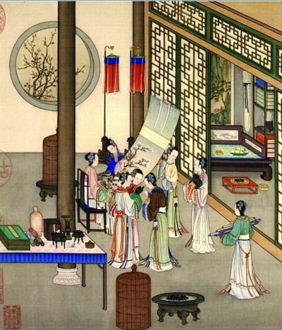 清代陈枚《月曼清游图》中的一帧“围炉博古”,描绘了清代贵妇们闲时聚在一起,欣赏书画的场景。左侧一张上接霸王枨下踩内马蹄足的画案,里屋一张三面围屏镶大理石的罗汉床,床前火盆颜色明亮,贵族生活的奢华考究可见一斑。