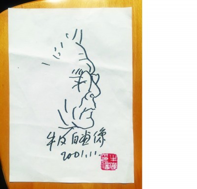 早就听说牛汉多才多艺,能拉胡琴、画画,但真人不露相,从未见过他的画。后从他的儿子史果处证实,于是委托史果求他的自画像,他答应画,可是迟迟不交卷。2009年1月26日,他委托史果赠我一本《我仍在苦苦跋涉》,从书中我才发现,他曾为不少中外诗友画像,他为聂绀弩画过塑像,为诗人洛尔迦、穆旦画过速写,2002年又凭印象默写了诗评家谢冕的头像;2001年为智利诗人聂鲁达画像,2002年又为俄罗斯女诗人阿赫玛托娃画像;普希金诞辰二百周年之际,他仿画了一幅普希金自画像。而在封面插页中, 赫然印有牛汉自画像,署款2001年11月。原来他早就画好了这幅自画像,只是舍不得交我。事后,我找史果说,可否复印一件自画像,入围《百美图》?史果欣然同意。