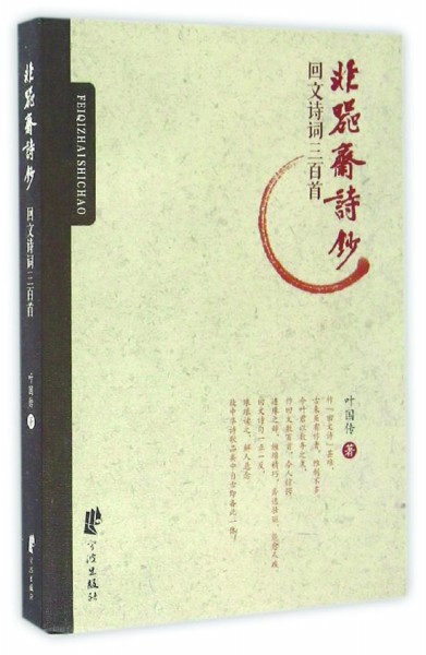 读叶国传先生《非器斋诗钞回文诗三百首》,可发现作者的创作和结集意图,一是在数量规模和体裁系统两方面传承和弘扬“中华诗歌品类中自古即备此一体”(郑孟津《非器斋诗钞回文诗三百首·序》),作者不但作了大量绝句,且涵盖律诗、小令、对联、趣字回文(包括顶针、拆字、十字)以及诗词合璧等等,曲尽其妙,尤其是不见古人创作的十六字令,作品丰赡,其中探讨了形式到内容的多种变化。二是创作的初衷,试图拓宽题材、开掘主题、扩大阅读对象,大有为当代的回文诗树立一根标杆的尝试。这里包含两个方面——