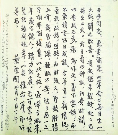 叶圣陶致徐开垒的书信始于1962年9月10日,“惠书诵悉。《笔会》每日出一大版,闻之欣喜。贵报越来越好,处处见得出工夫。我日看四种报,所费时间,以贵报为多。承嘱作文,义不容辞”。徐开垒在信纸边上写有注释:“这封信是叶圣老在1962年9月写的。当时党中央召开七千人大会以后不久,由于纠正了‘大跃进’和‘反右倾’的错误,报纸版面做了些革新,曾受到各方面的欢迎。”