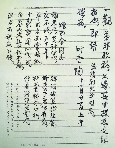 信中写道:“近日作一诗赠巴金同志,录请一观,并非投稿,只缘其中提及《文汇报》也。”