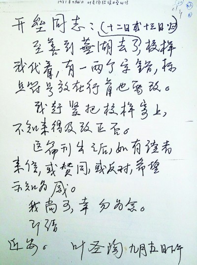 叶圣陶后来还在徐开垒寄来的清样上校改。他对这篇文章萦怀于心,在回信中写道:“这篇刊出后,如有读者来信,或赞同,或反对,希望示知为感。”( 1981年9月5日)文章发表后,真的有读者来信表示商榷,徐开垒把这些信都寄往了北京。因此,这篇文章应该是叶圣陶的佚文。