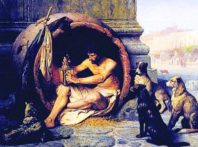 说他是怀疑派,虚无主义,恐怕未到位;说他属古希腊的犬儒主义,可能更靠谱,因为他崇拜第欧根尼(Diogènes,前412-323年),犬儒主义的代表人物。第欧根尼,古希腊哲学家,行为偏僻性乖张,在人来人往的雅典神庙门廊底下,将一个大木桶作为自己的家,平日就住在里面;光天化日底下,提着一盏灯上街,因为世界太黑暗!反常?正常?失序?有序?首先你觉得搞笑。他宣扬简朴的生活,去掉常人的所谓骄傲,干脆接受“天狗”这个称号。实际上,他是满身带刺的挑衅者。有一回,亚历山大大帝拜访他,他正在晒太阳,对大帝的来访无动于衷,还说:“你可以靠过一边么,不要挡住我的阳光!”大帝海涵包容,说:“如果我不是亚历山大,我愿意成为第欧根尼。”