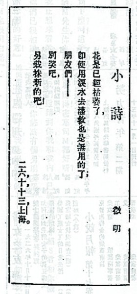 索非在《新女性》第一卷十二月号首次署名“微明”发表补白性质的《小诗》。