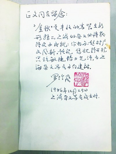 晚年的罗老,著述与编书甚丰,他先后送过我三四册由他撰写与主编的书,他在一本《杂家与编辑》上为我题字:“海内存知己,天涯若比邻。正文同志教正。罗竹风”。另一本是《上海杂文选》,他在扉页上题了一行字:“正文同志留念:金秋是丰收的季节。在新形势下,上海的杂文必将获得更多成就:作者多,题材广,文风新。预祝,您视野开阔,思路敏捷,精力充沛,为上海杂文学会多有建树。罗竹风。”这些鼓励之言,让我终生受用。
