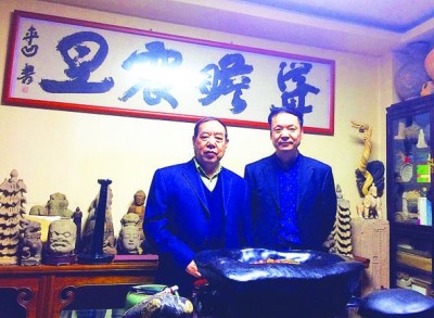 趁着贾先生进侧屋倒水的空隙,我再次环顾先生的工作室。客厅正面墙上,挂着先生手书的“耸瞻震旦”四个行书大字,寄托了他的谦逊为人和在文学上的远大志向;室内靠墙几乎全是书橱,整整齐齐摆放着平凹先生出版的多种版本的书籍,再就是见缝插针似地摆放着瓦当、佛像、佛头、石蛙之类的藏品;就连橱顶上都摆满了古董——瓶瓶罐罐,包括地上也站着一行笔筒大的石头造像,仿佛是给他看家护院的小卫队,让人没处下脚,抬腿转身得处处小心。