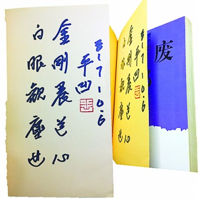 由于贾先生的“粉丝”量巨大,他每月差不多有二十五天在为读者签名,可谓应接不暇。他一般只程式化地签“平凹 某年某月某日”;有要求题写上款的,则不厌其烦地写上“某某先生(女士)正”的字样。