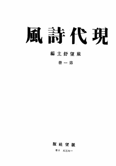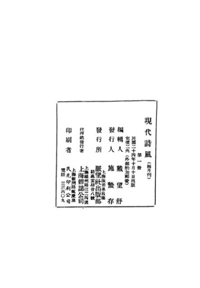 1935年7月31日出版的《文饭小品》第六期刊有《本社启事两则》,第一则是《〈现代诗风〉再展期》:“戴望舒先生主编之《现代诗风》,创刊号本定七月十五日出版,现因新出版法规定,杂志出版须先经过登记手续,故不得不一再展期,俟登记手续办妥,即可印出也。”10月10日,《现代诗风》终于创刊,封面署“戴望舒主编 第一册 脉望社版 一九三五年十月”。施蛰存在刊首写有《文饭小品废刊及其他》:“《现代诗风》两月刊,说不定又是一注亏本生意,鄙人因为自己也不敢担保它的寿命,所以这回不再预定了。”《现代诗风》的寿命果真无法“担保”,“创刊就是停刊,仅出了一期就寿终正寝,以至在新诗史上鲜有人提及”(陈子善语)。