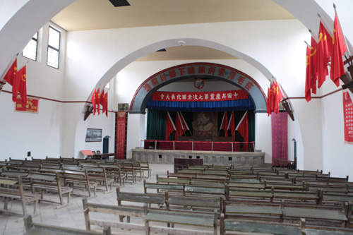 整个建筑体块结构,彼此支撑,相互关联,外表庄重、刚毅、洋气,内里大跨度穹隆式空间,视线高度集中,意志绝对统一,乡土的朴实与同志的温暖都融会在革命大家庭的亲切里。建筑艺术地诠释了中共“七大”所实现的中国革命政治理想。