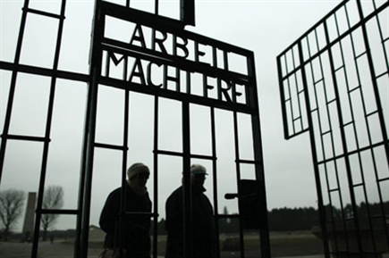 奥斯维辛集中营的一座大门。具有反讽意味的是,大门上的标语写着“劳动使人自由”。