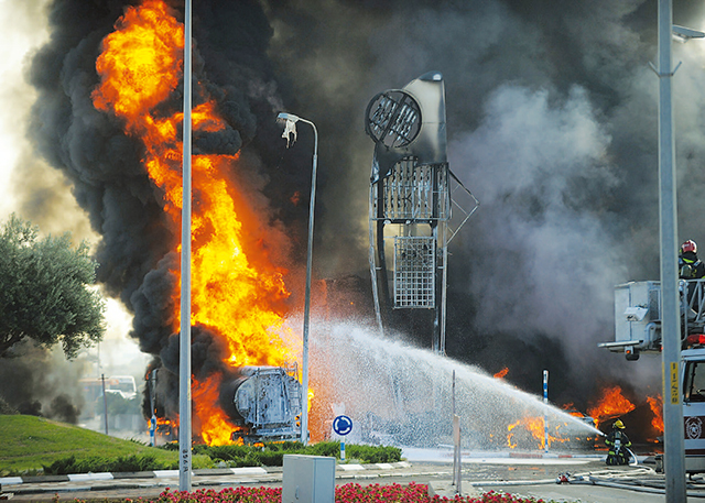 11日,在靠近加沙边境的以色列南部城市阿什杜德,消防人员在遭到火箭弹袭击的一家加油站灭火。