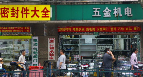 北京东路沿街密集地分布着售卖各种机电五金产品的商铺。袁婧 摄