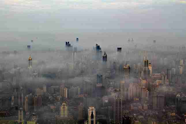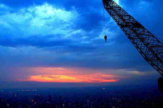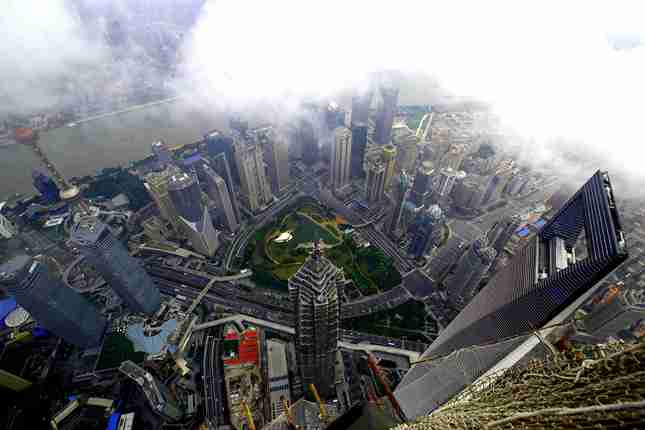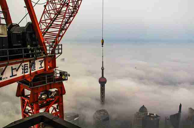 ▲2013年9月12日摄于上海中心,吊车的影子投射在云层上,后景是浦西的高楼大厦。